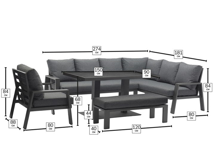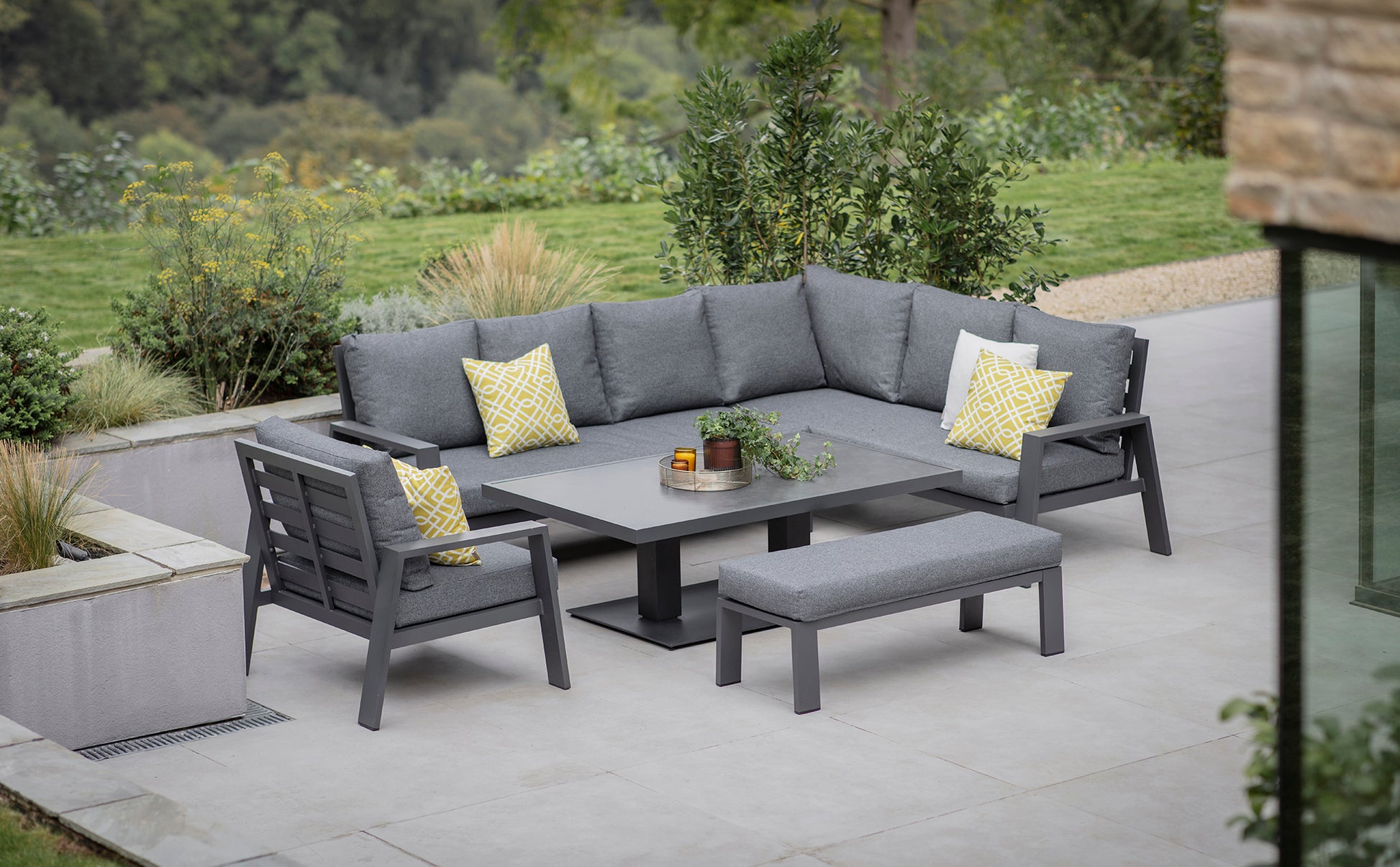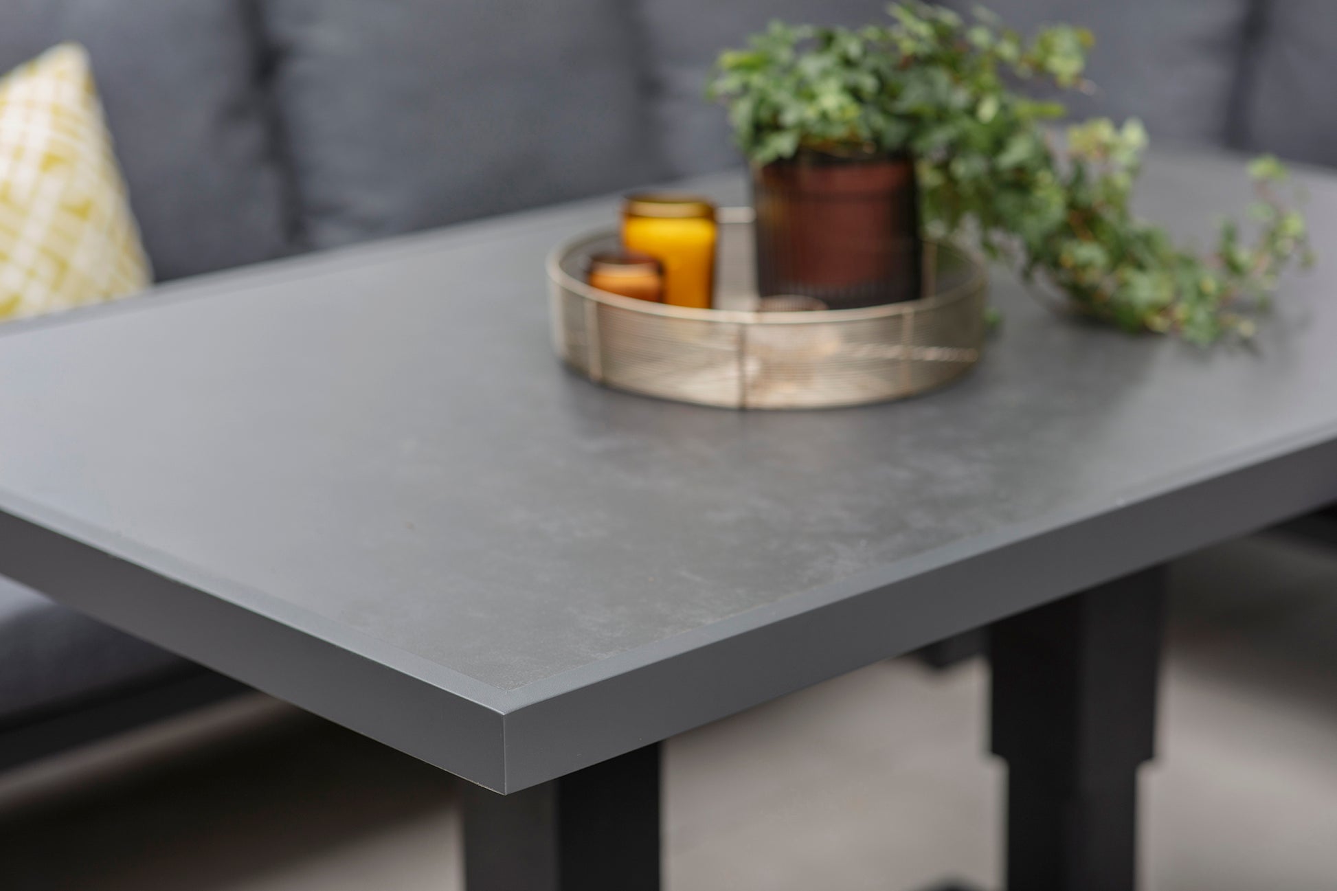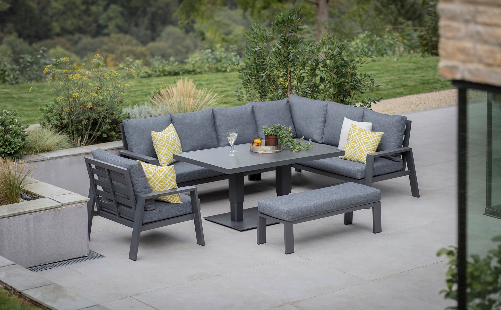 Our contemporary Amsterdam L-shape set has smouldering good looks and deep chill out vibes written all over it. The clever height-changing table can be adjusted by just one person using the simple lever control. Raise the table to dining height or lower for morning coffee - a versatile set covering all your alfresco entertaining options.