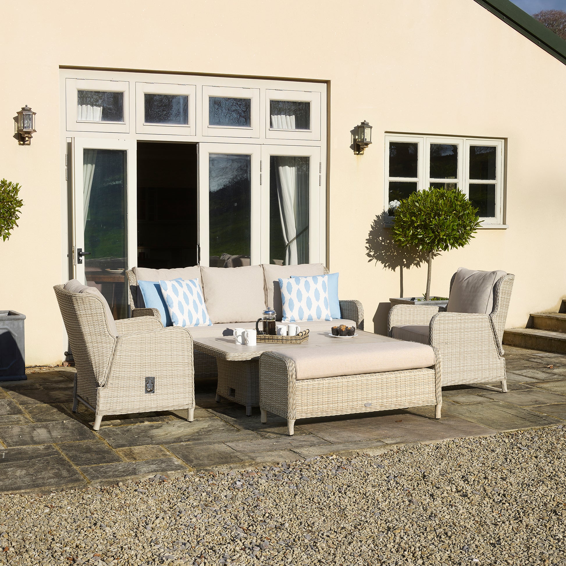 This sociable set will seat your friends and family in style. A casual coffee with the table low or a long, lazy lunch with the table raised. For a spot of sunbathing or stargazing, simply recline the sofa and armchairs and look skywards. A handy padded bench adds to seating arrangement. Lots of eating and seating options for this highly versatile sofa and dining set rolled into one.