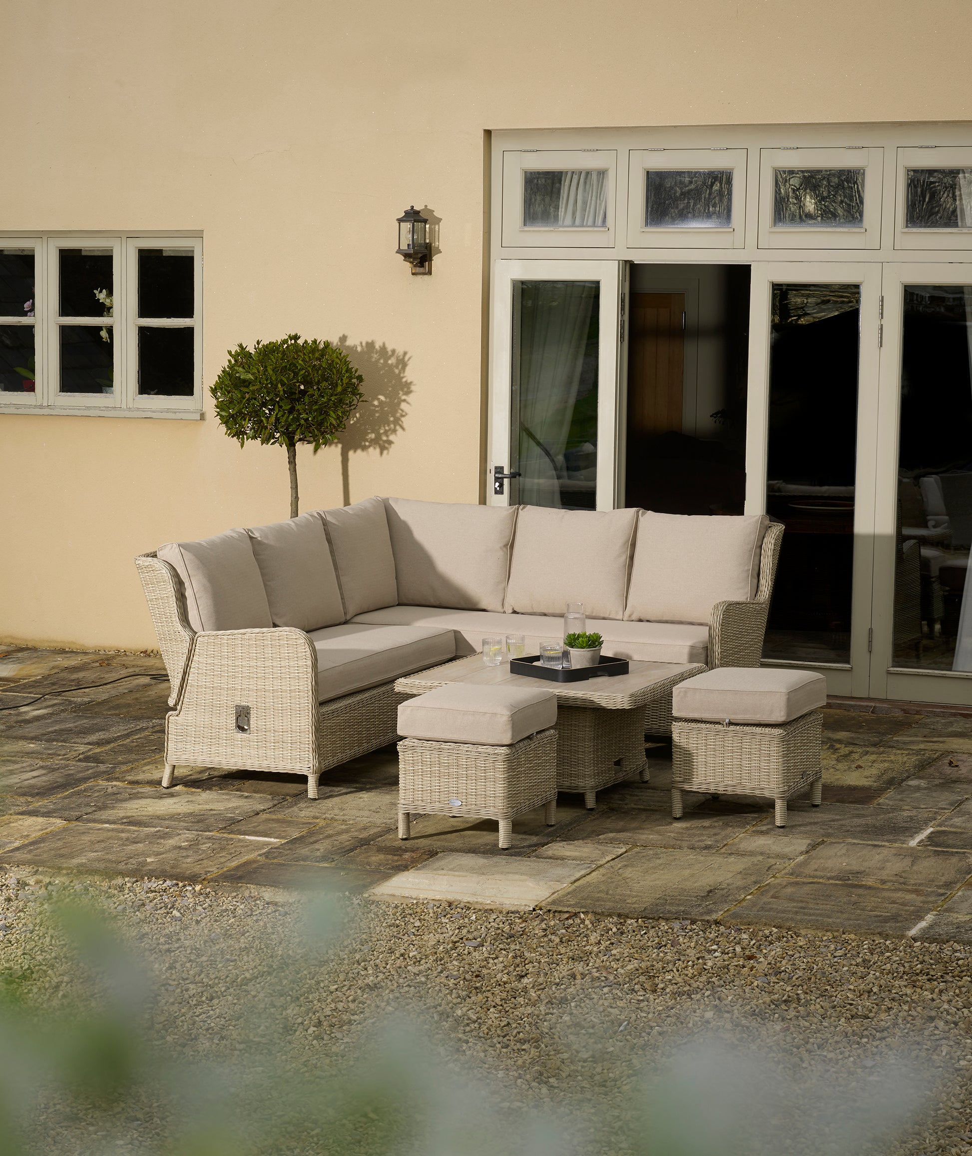 Meal time or me time? Our mini reclining modular sofa set ticks both boxes and is perfect for smaller outdoor spaces. Enjoy a lazy lunch and simply recline the sofa to indulge in a post-meal catnap. With its multi-functional table - dining to coffee table height in an instant - and pair of stools, this set really has small space versatility written all over it.