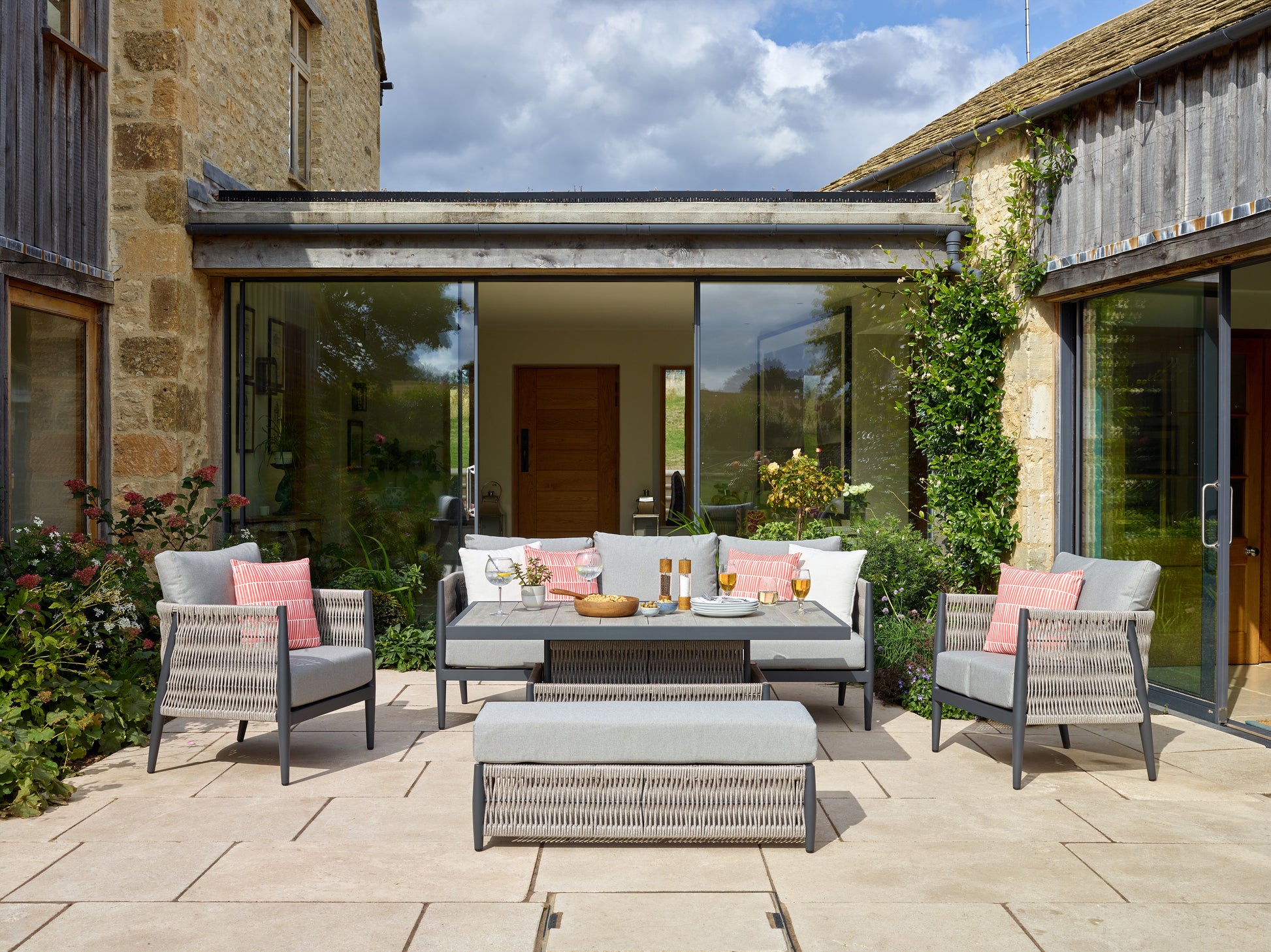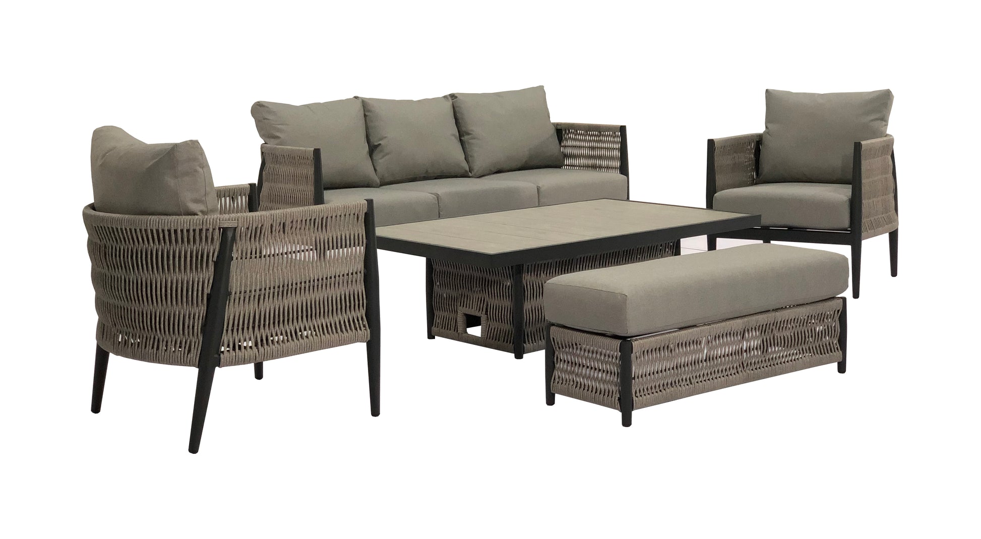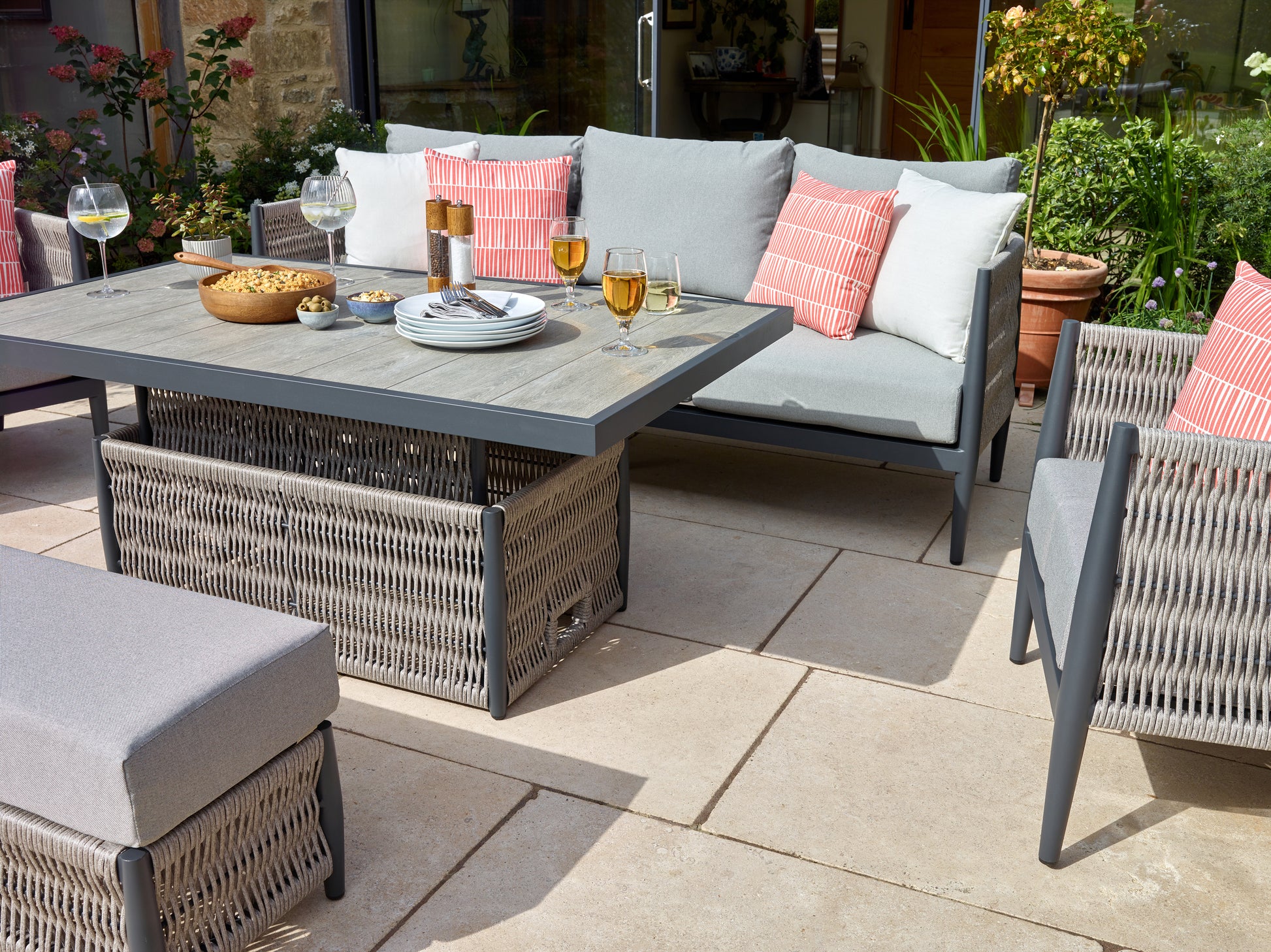 Choices, choices - sofa, armchair or bench? The versatile mix of seating in this sociable sofa set creates an easy-going, laid back vibe. The table at its lower height is perfect for pre-dinner drinks or a casual coffee. Simply raise the table to dining height and your alfresco feast can begin.