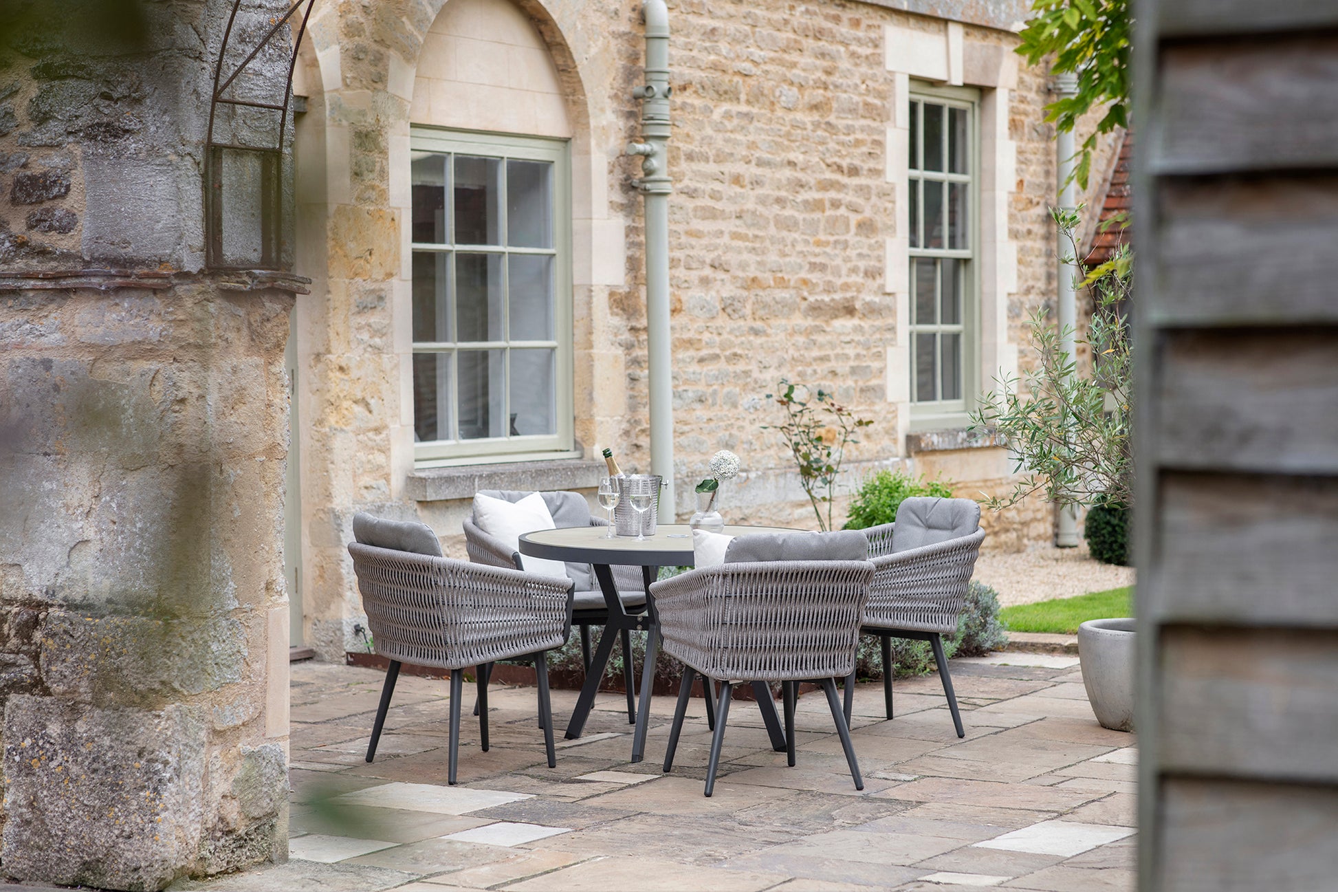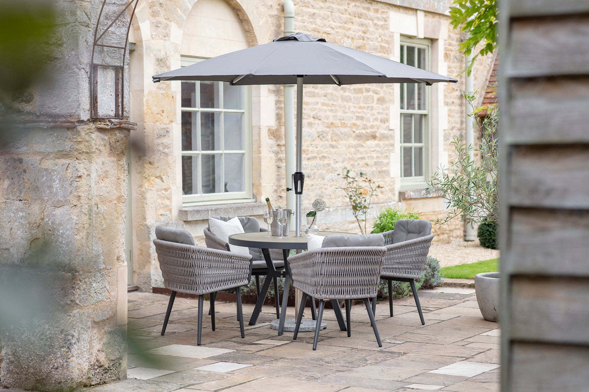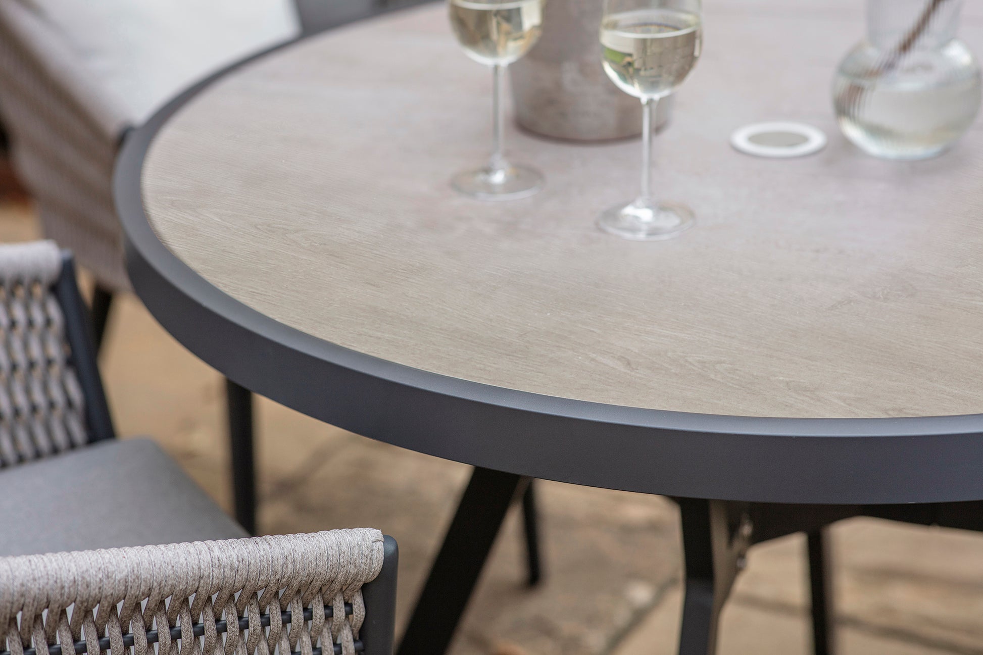 Enjoy stylish, small space dining with our Mauritius round dining set. Dining chairs feature a unique vertical rattan rope woven onto a smart aluminium frame with a gently rounded profile. The speckled Heron Grey synthetic rope blends beautifully with the contemporary Anthracite Grey frame.